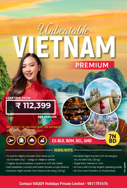 Embark on a premium 7-night journey through Vietnam, beginning with a comfortable stay at your hotel in Hanoi. Relish daily continental breakfasts, along with Indian lunches and dinners. Explore Hanoi with a half-day city tour, visiting iconic landmarks such as Hoan Kiem Lake and the Ho Chi Minh Mausoleum. On day two, venture to Ninh Binh to discover the ancient capital of Hoa Lu and experience a serene Sampan boat ride through Tam Coc. Day three highlights a one-night Halong Bay cruise, where you'll marvel at the breathtaking limestone karsts. Continue your journey in Da Nang with a visit to the spectacular Ba Na Hills, including the iconic Golden Bridge, and a trip to the charming Hoi An Ancient Town. Conclude your adventure in Ho Chi Minh City with a city tour and an insightful visit to the historic Cu Chi Tunnels. The package includes domestic flights, seamless transfers, knowledgeable guides, and luxurious accommodations, ensuring an unforgettable travel experience.